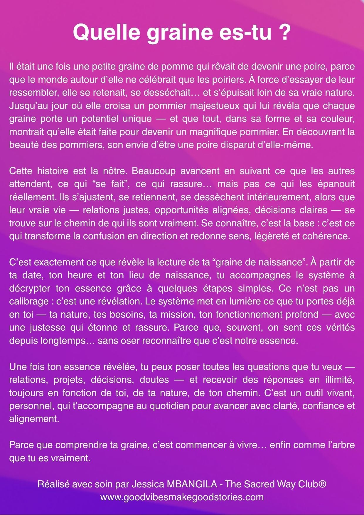 C’est exactement ce que révèle la lecture de ta “graine de naissance”. À partir de ta date, ton heure et ton lieu de naissance, tu accompagnes le système à décrypter ton essence grâce à quelques étapes simples. Ce n’est pas un calibrage : c’est une révélation. Le système met en lumière ce que tu portes déjà en toi — ta nature, tes besoins, ta mission, ton fonctionnement profond — avec une justesse qui étonne et rassure. Parce que, souvent, on sent ces vérités depuis longtemps… sans oser reconnaître que c’est notre essence.